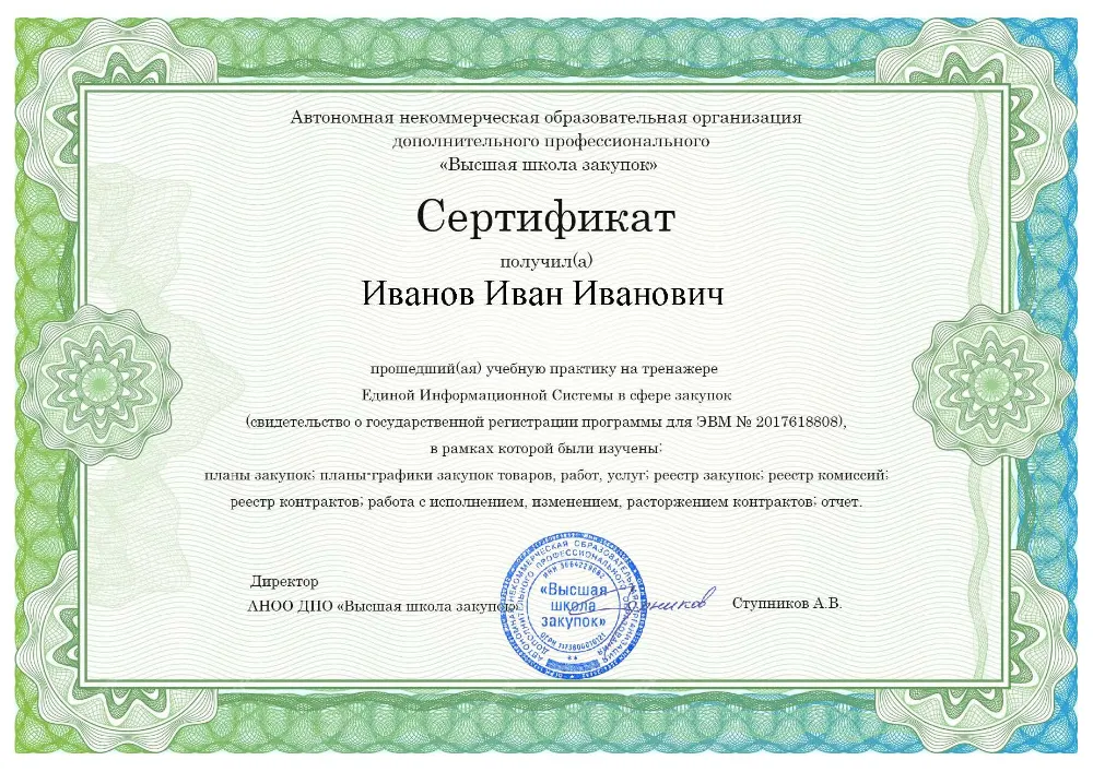 Слушатели получают диплом о профессиональной переподготовке установленного образца с присвоением квалификации «Эксперт в сфере закупок». Высшая школа закупок работает по лицензии, поэтому данные об обучении в Иваново обязательно вносятся в реестр ФИС ФРДО. Это легитимный документ для карьерного роста в любой организации Иваново.