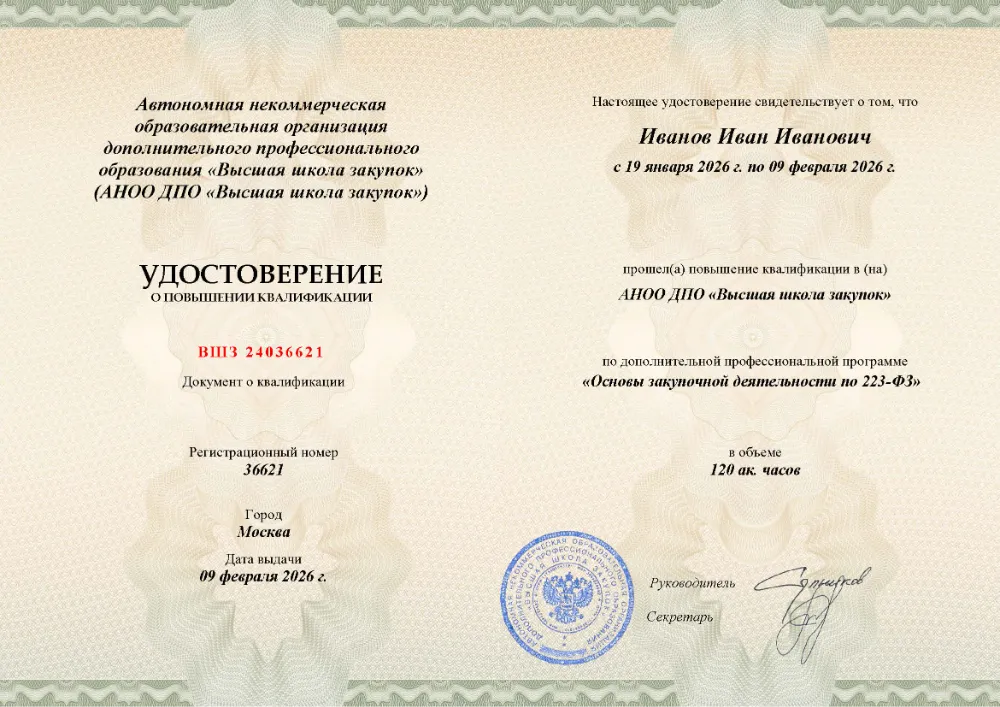 Вы получаете официальный документ о повышении квалификации. Высшая школа закупок (fz44.org) в обязательном порядке вносит сведения об обучении в Иваново в реестр ФИС ФРДО, подтверждая легитимность вашей подготовки перед контролерами.