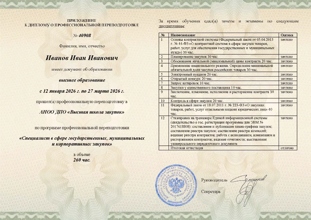 Вы получаете диплом о профессиональной переподготовке с присвоением квалификации специалиста. Высшая школа закупок (fz44.org) вносит сведения об обучении в Иваново в реестр ФИС ФРДО, подтверждая ваш экспертный статус перед крупными заказчиками.